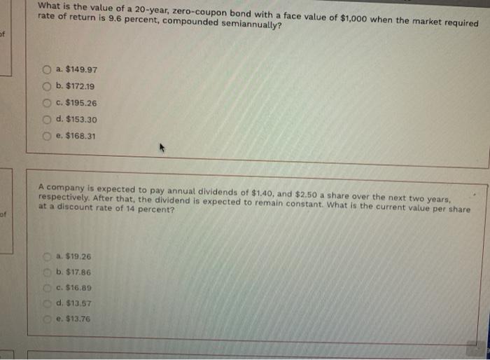 Solved Find the face value of the zero-coupon bond. | Chegg.com Find the face value of the zero-coupon bond. 20-year bond at 5.95 %; price $9050 The face value of the zero-coupon bond will be $ ____. (Round to the nearest dollar as needed.) Question: Find the face value of the zero-coupon bond. 20-year bond at 5.95 %; price $9050 The face value of the zero-coupon bond will be $ ____.